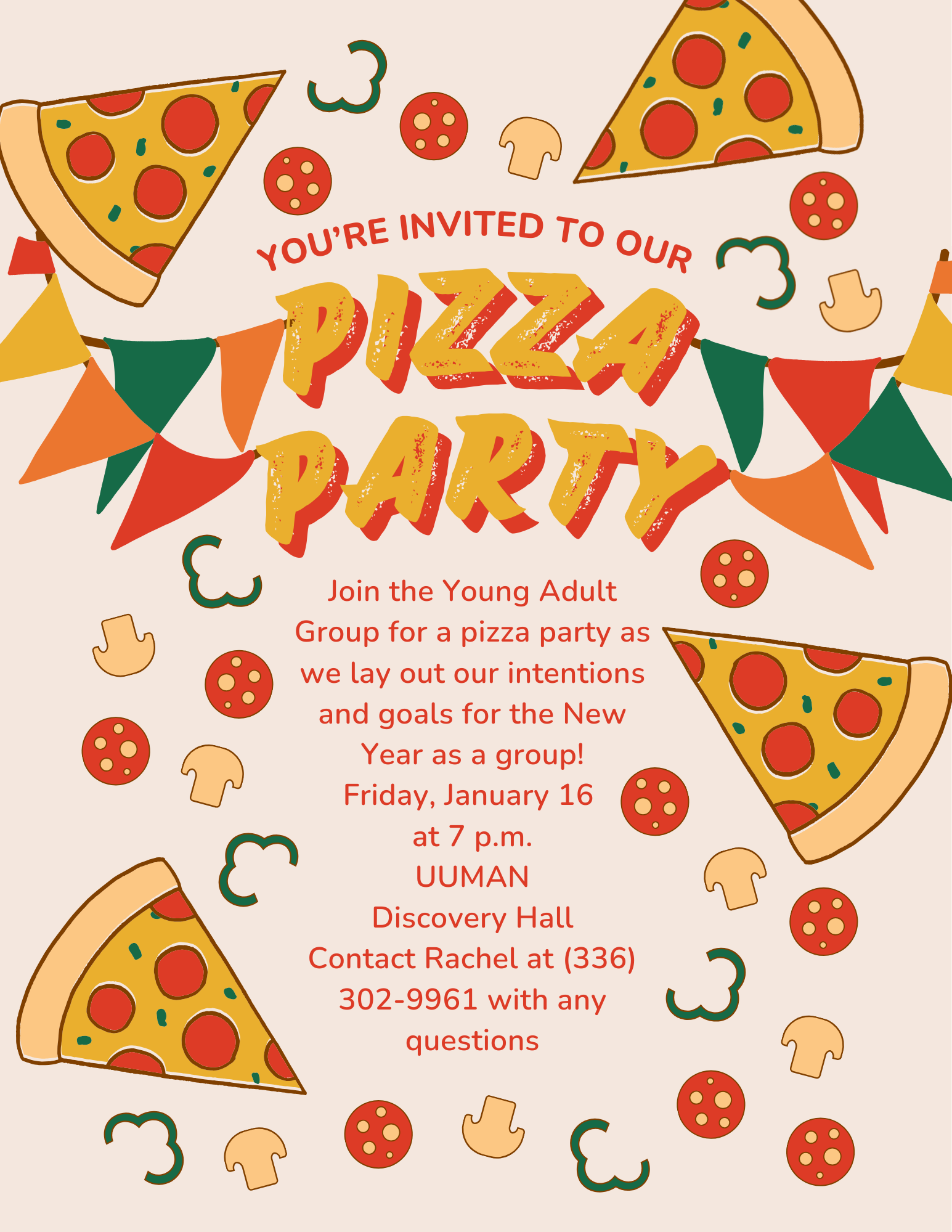 Join UUMAN Young Adults for a Pizza & Planning Party to welcome in the New Year and set goals and intentions as a group for 2026. Contact Rachel Osborne at (336) 302-9961 with any questions.