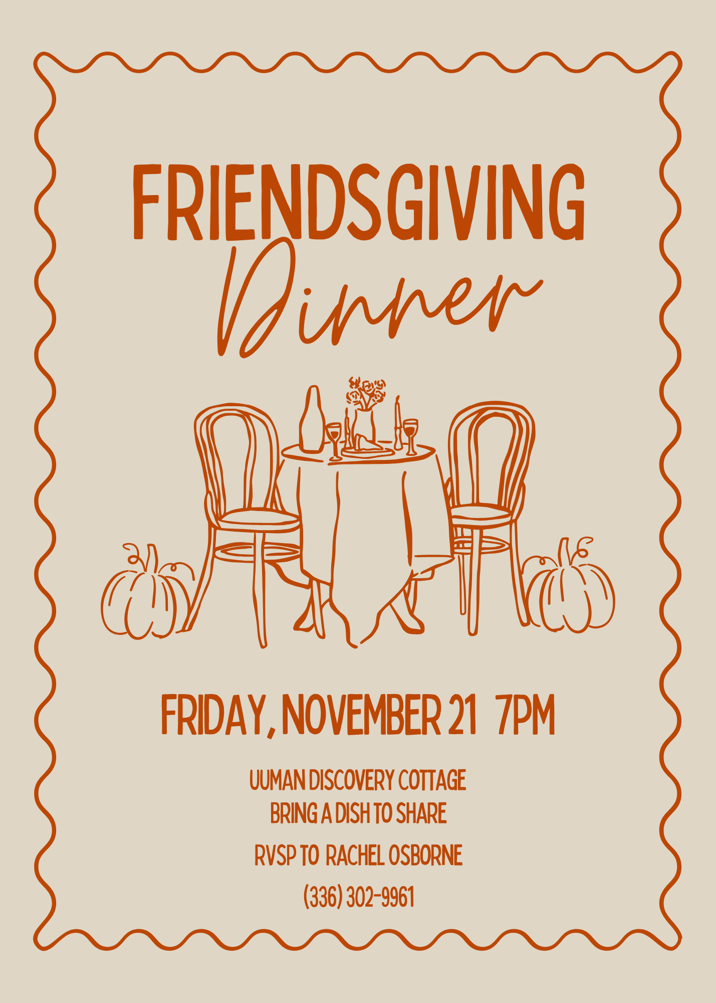 Join UUMAN's Young Adult Group for Friendsgiving 7pm Friday, November 21st in the Discovery Cottage. Bring a dish to share and items to pack in college student care packages!